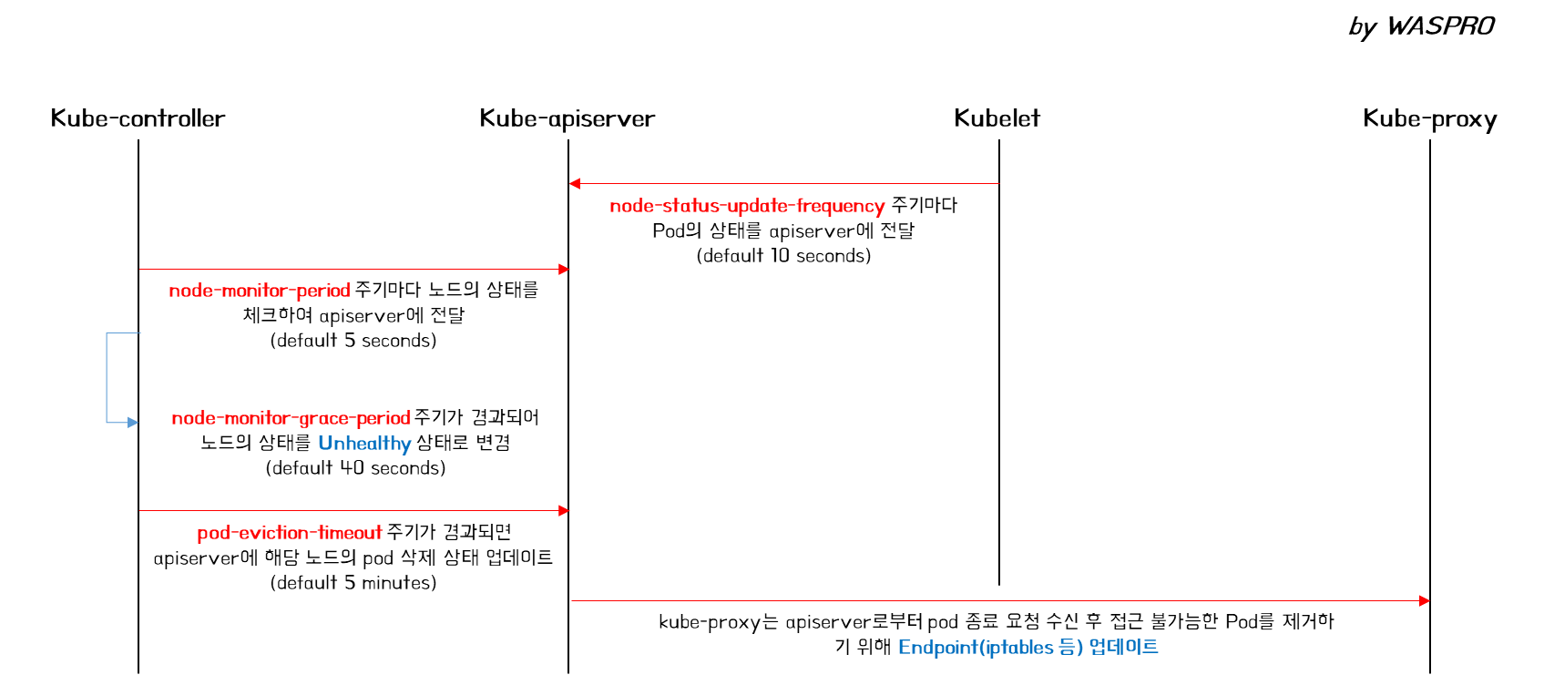 ## 특히 노드 가용성을 확보하기 위해 무작정 default 시간을 줄일 경우 역효과가 날 수 있다. node unhealty & endpoint에서 제거되면, 해당 pod는 타 노드에서 requires 수 많큼의 pod를 유지하기 위해 기동된다. 이는 scaling이 발생되며, pod 기동 시 발생하는 load와 일시적인 지연 현상이 발생될 수 있다. pod-eviction-timeout은 이를 방지하기 위해 해당 시간 내 node의 상태가 복구되면, 해당 pod를 다시 서비스에 포함하는 역할을 한다.