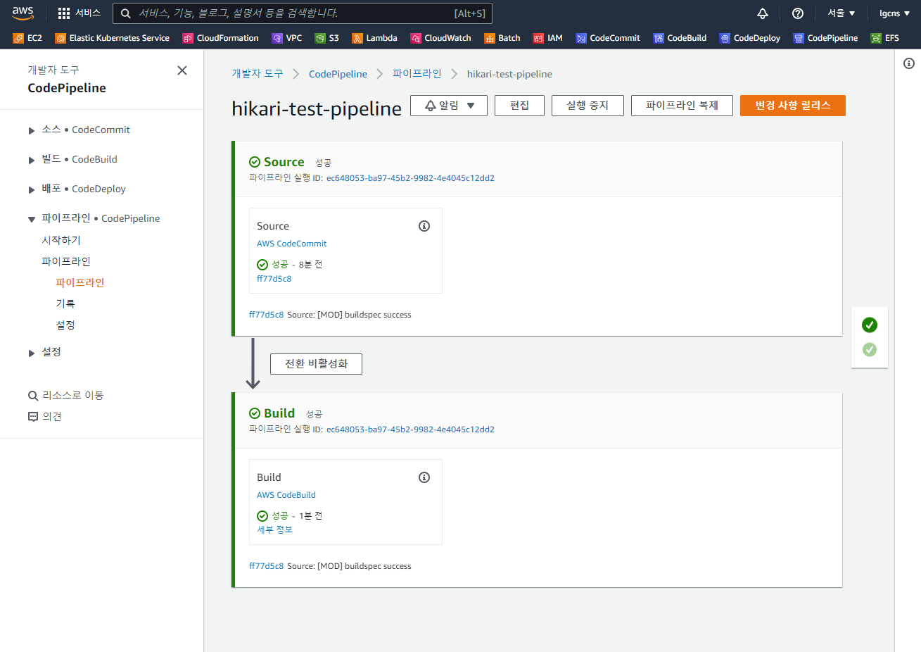 위와 같이 Kubernetes Service와 Pod가 배포된 것을 확인할 수 있다. 특히 파이프라인의 변경 감지 옵션에 따라 소스코드가 AWS CodeCommit에 배포되면 자동으로 파이프라인이 동작하게 된다.