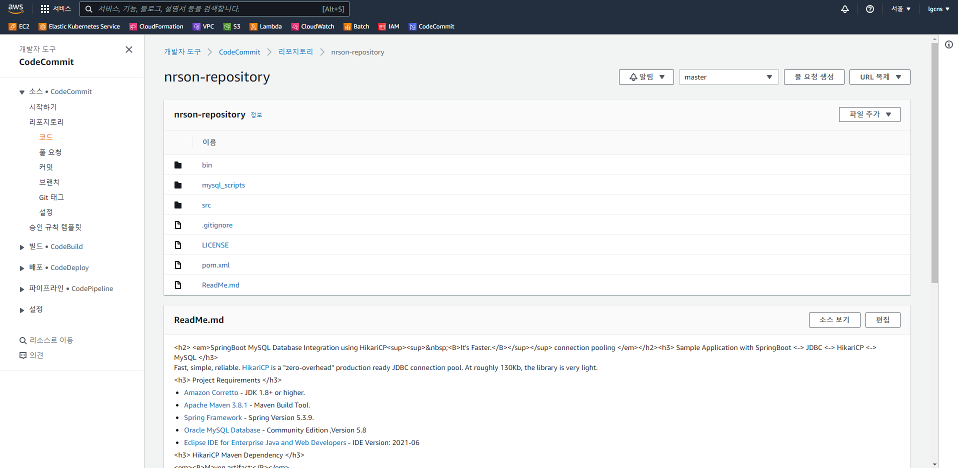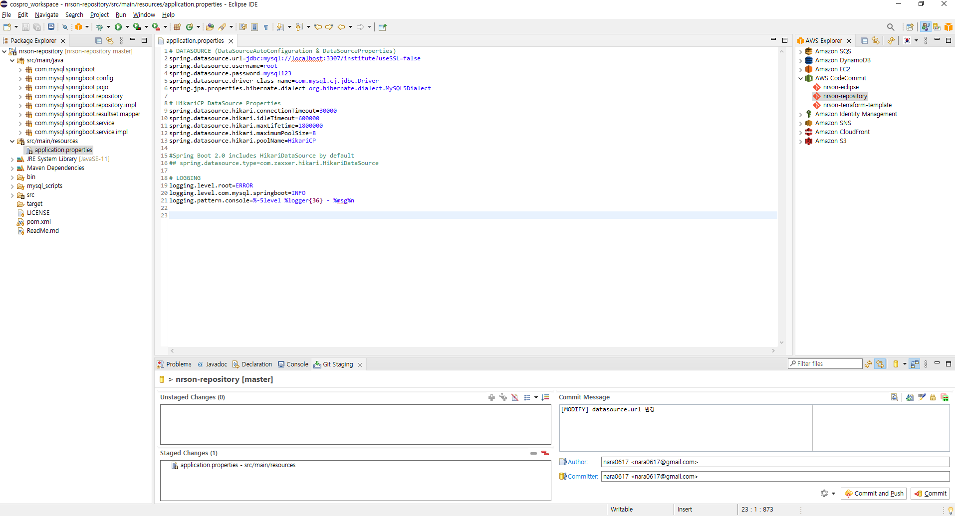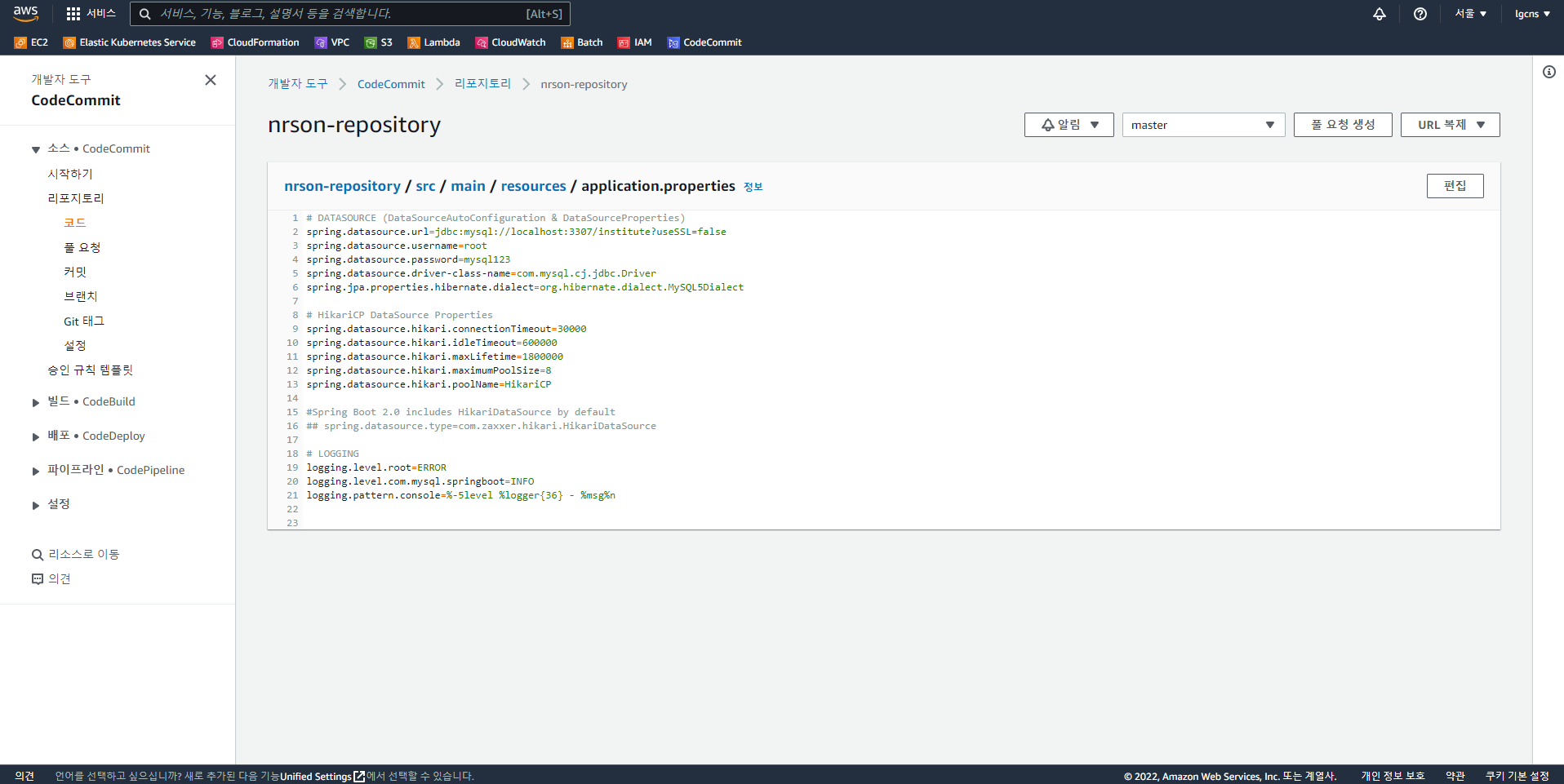 CodeCommit에 변경된 datasource url이 반영된 것을 알 수 있다.