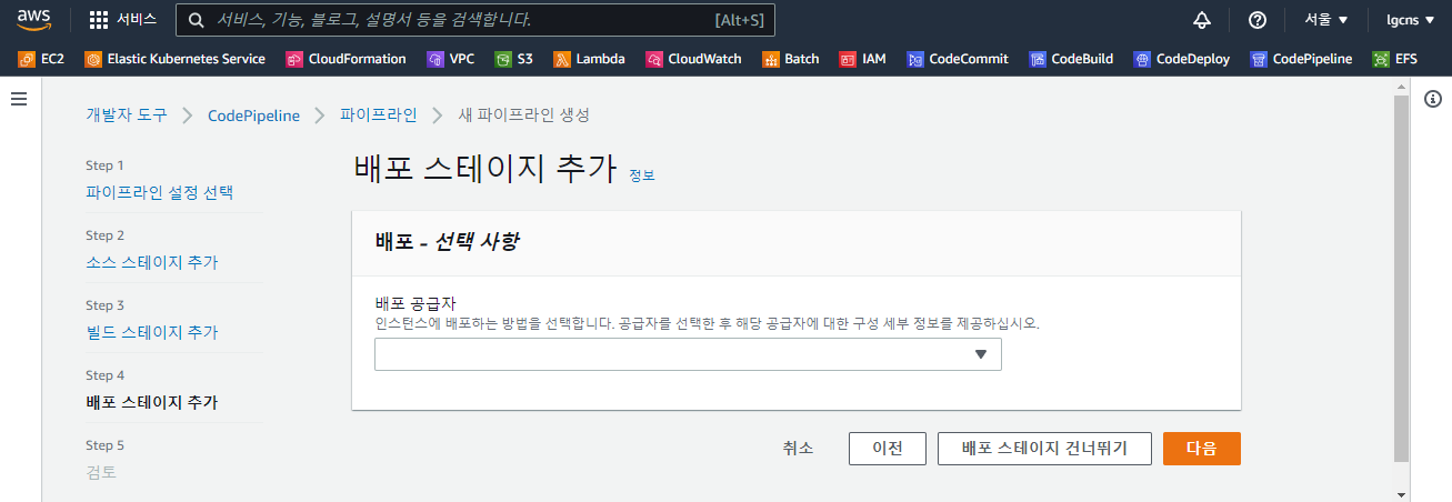 앞서 이야기한 바와 같이 AWS CodeDeploy는 AWS EKS를 지원하지 않아 배포 스테이지는 건너뛰기 한다.