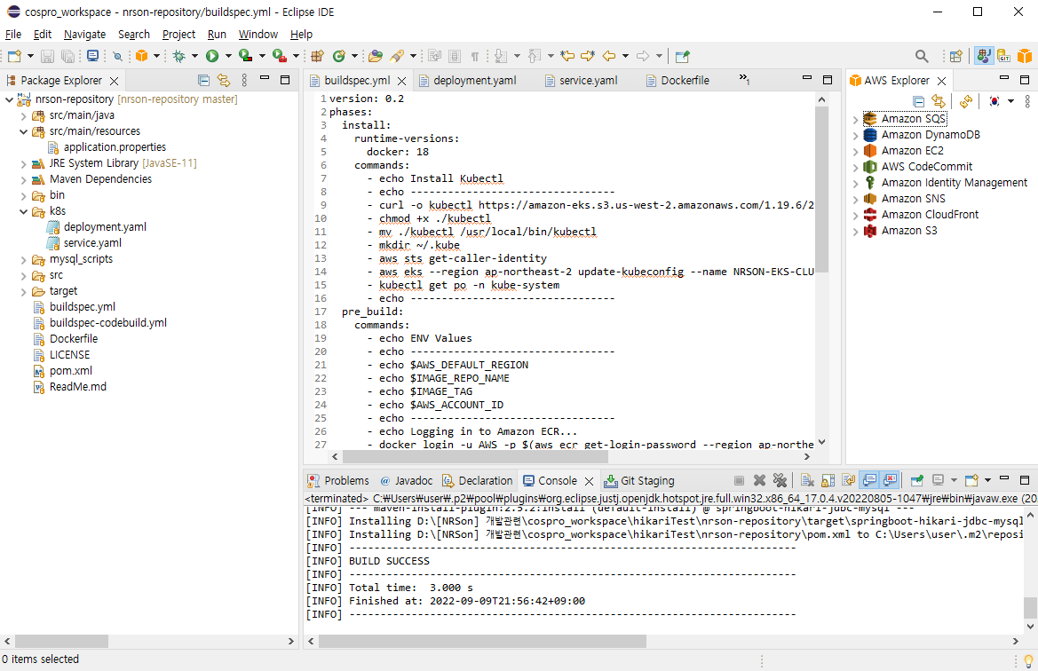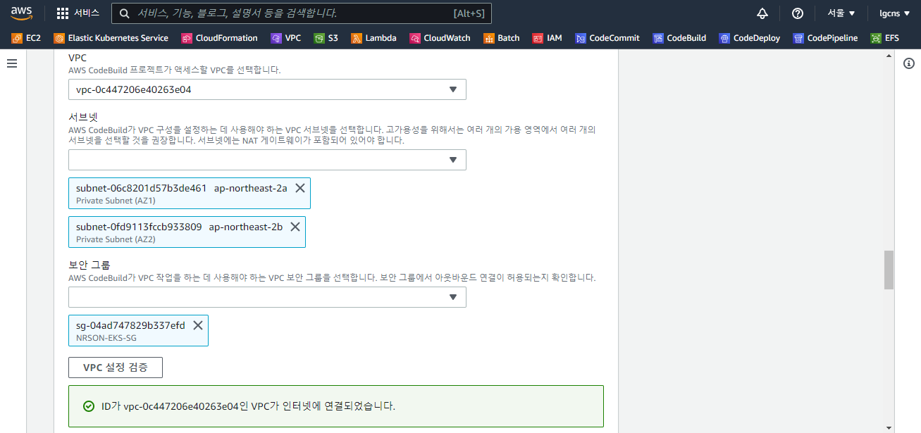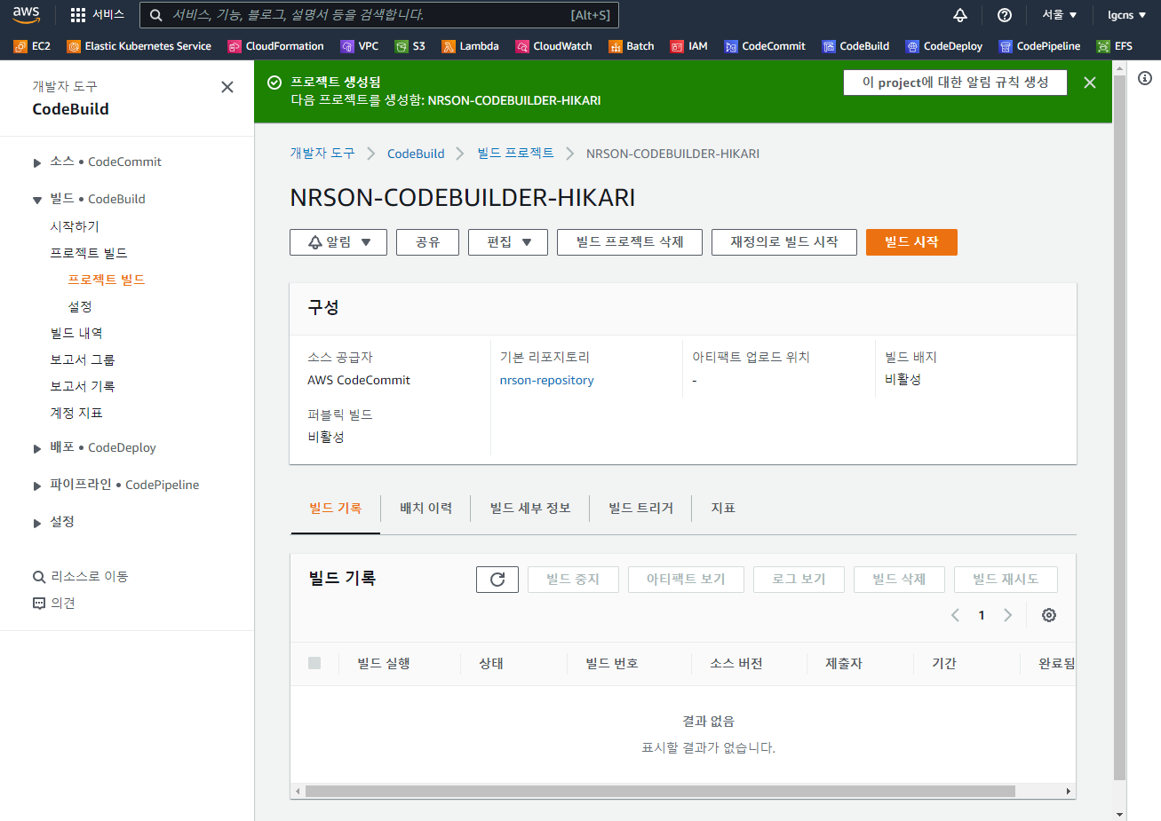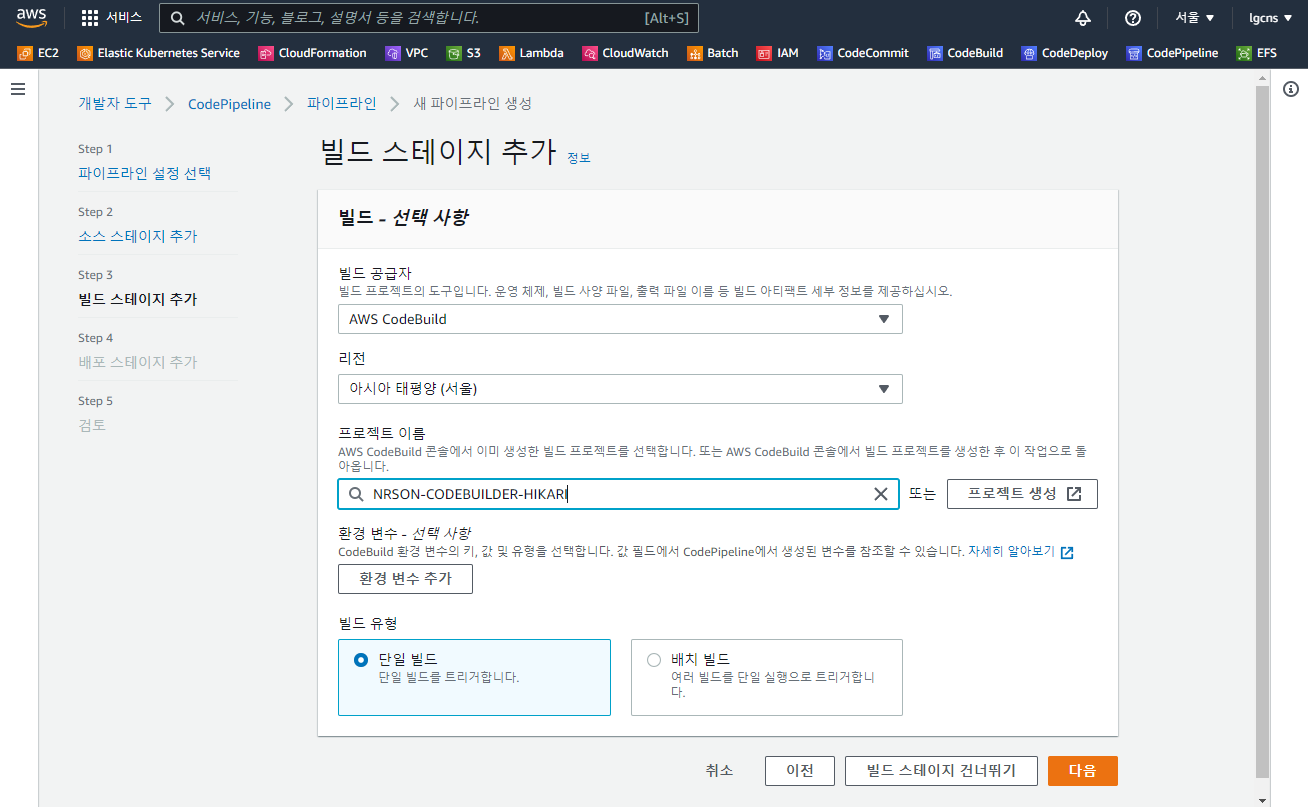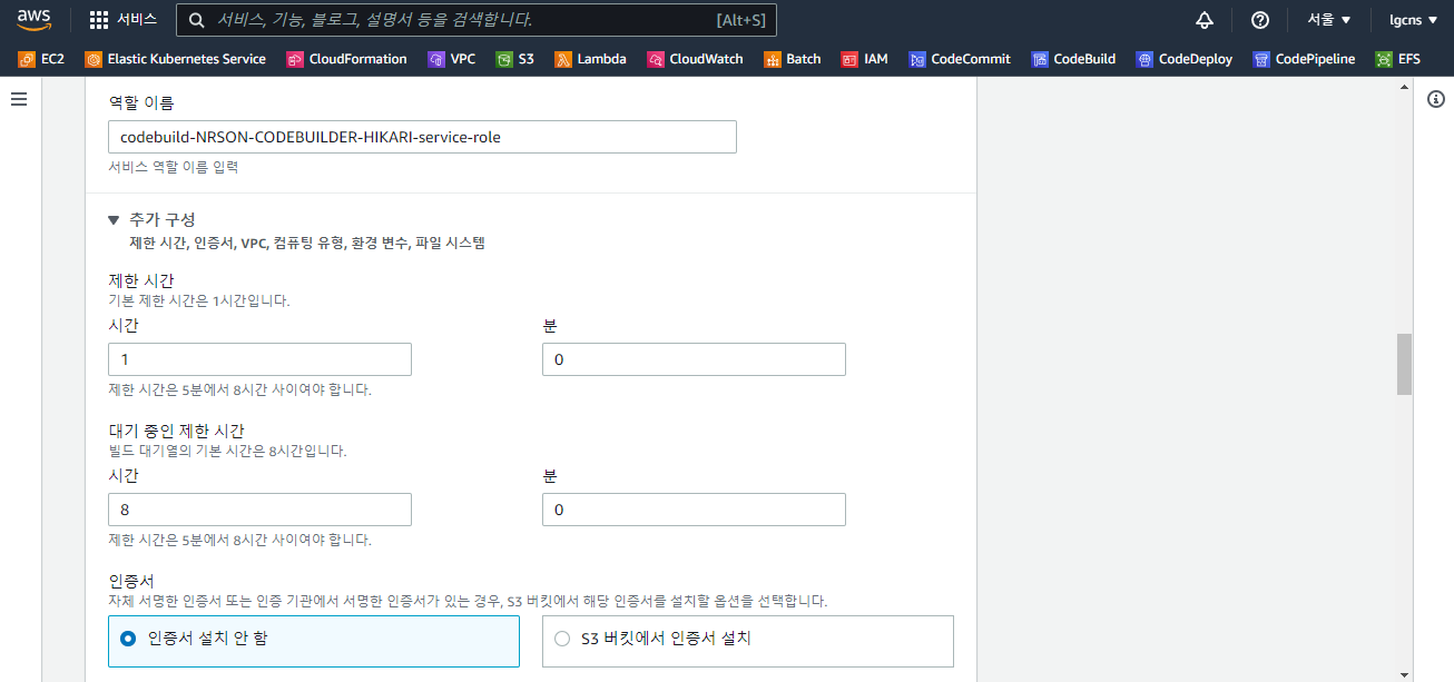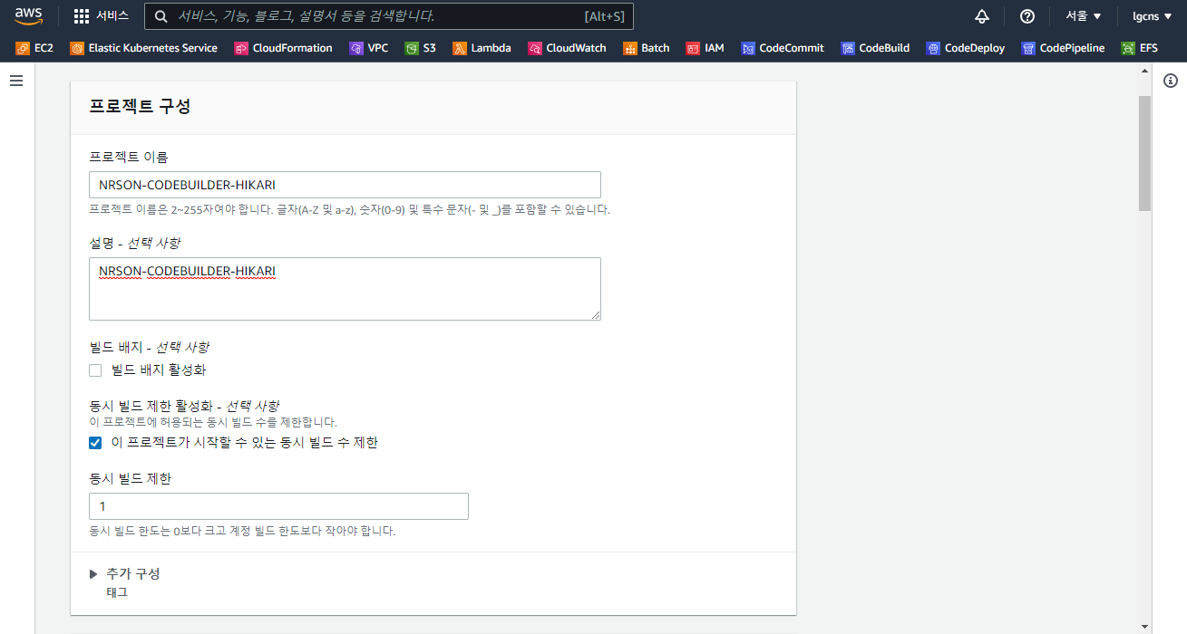 - 프로젝트 이름 : AWS CodeBuild 프로젝트 이름 (ex - NRSON-CODEBUILDER-HIKARI)