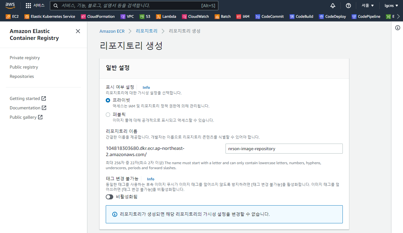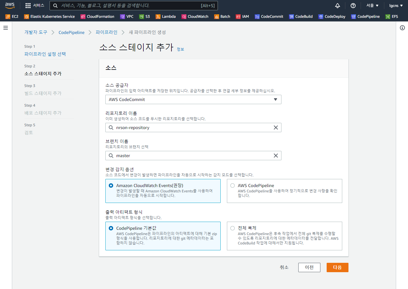 - 리포지토리 이름 : 해당 소스 공급자에 등록되어 있는 Repository를 선택 (ex - nrson-repository)