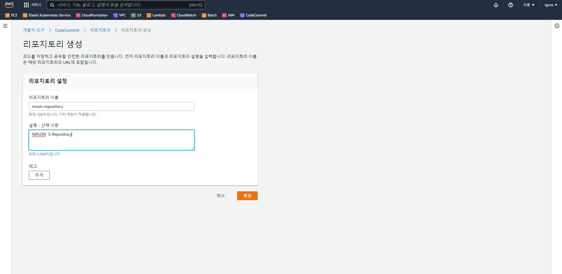 ▶ CodeCommit - Repository > 리포지토리 생성