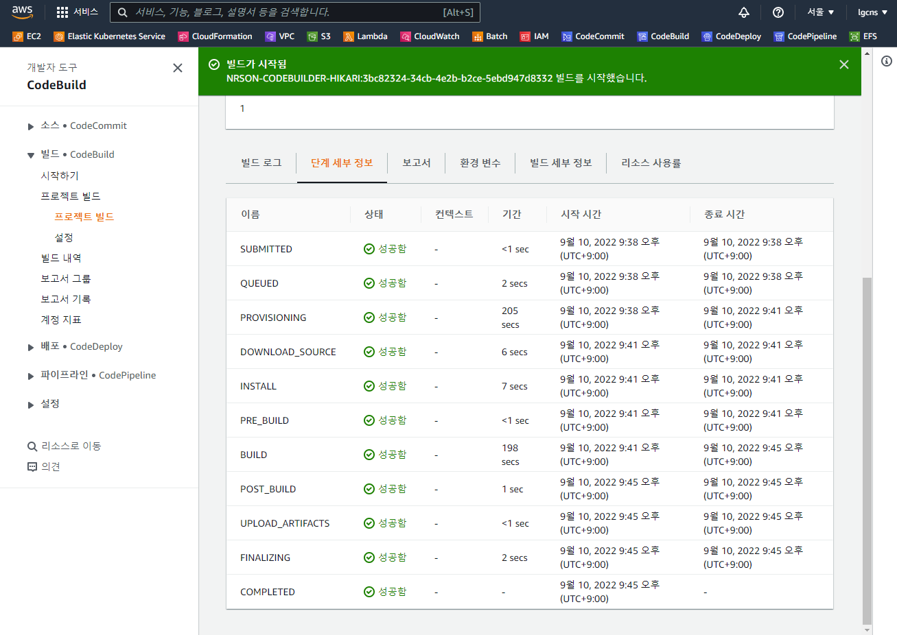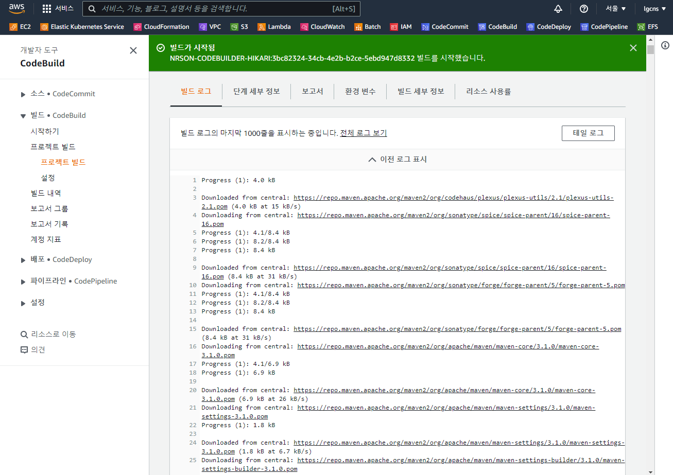 - 빌드 로그 : buildspec.yml의 처리 과정이 로그로 나타나며, 전체 로그 보기는 CloudWatch, 테일 로그는 CodeBuild 내에서 로그의 변화를 모니터링할 수 있다.