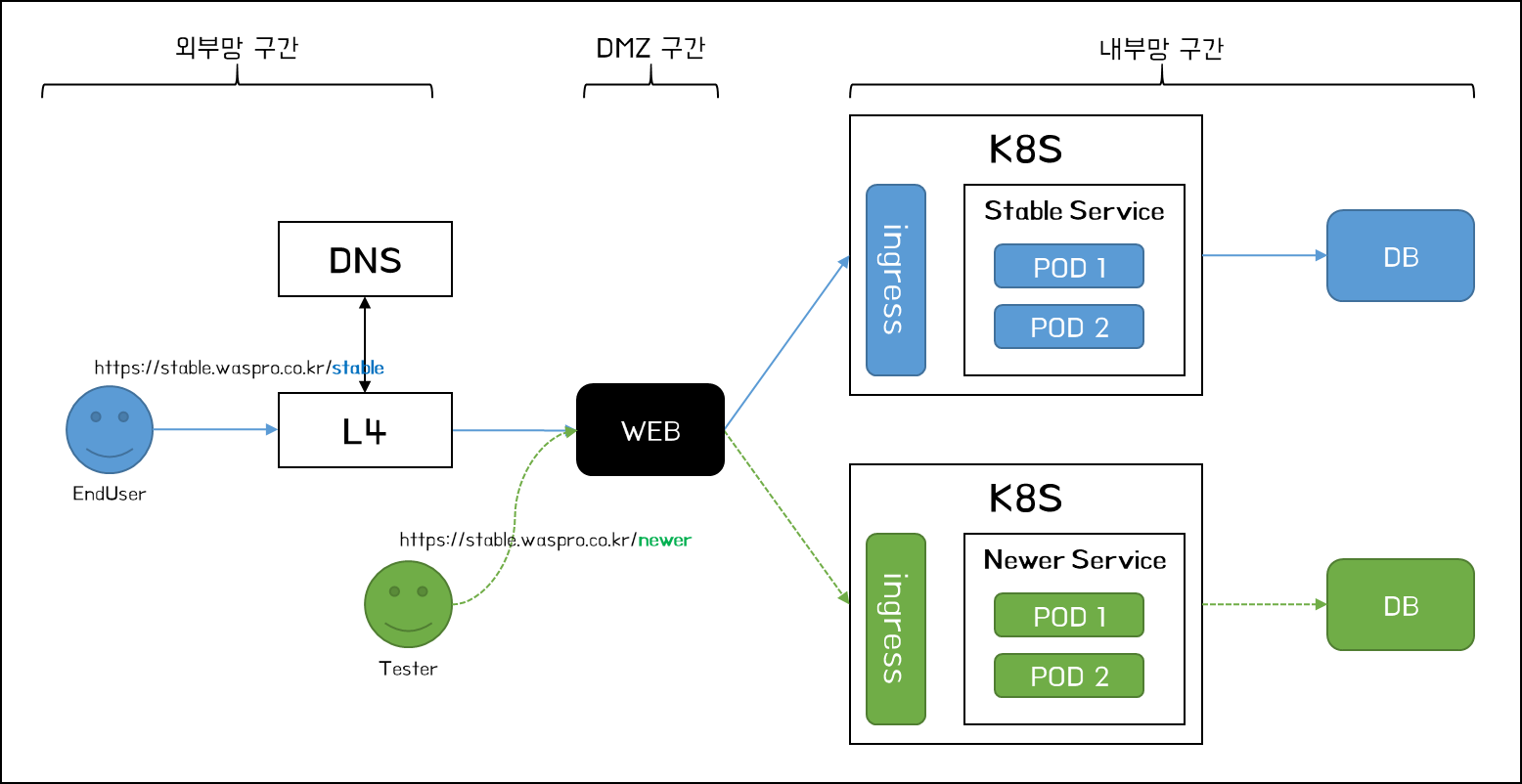 - Blue 영역(AS-IS) : stable.waspro.co.kr/stable(예시) > L4 > AS-IS WEB > AS-IS Container Mgmt > DB