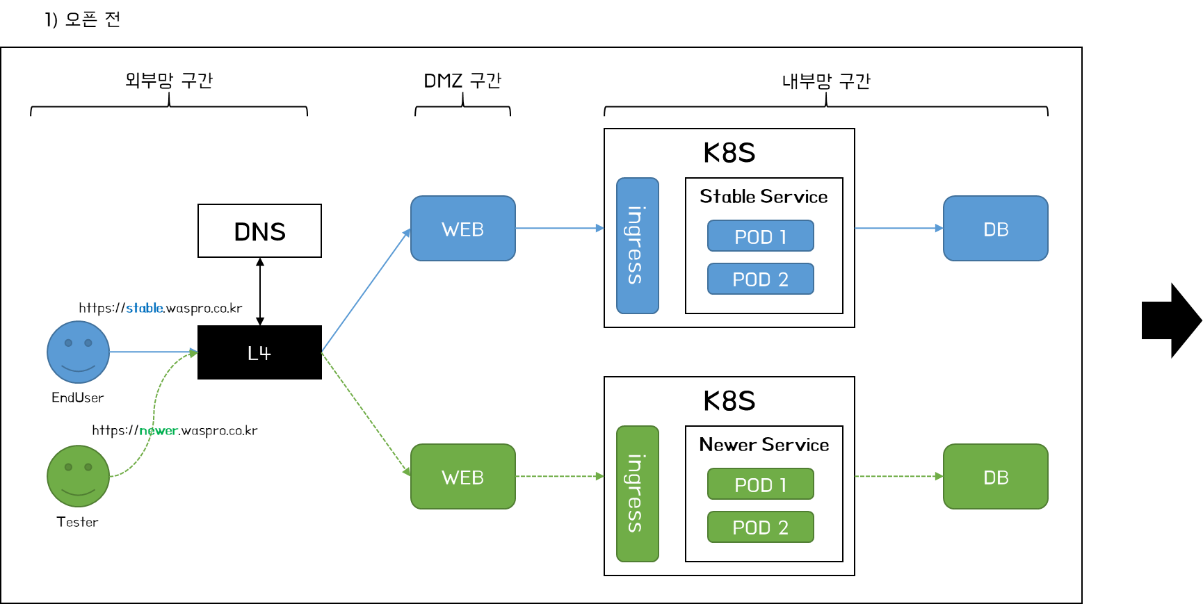 - Green 영역(TO-BE) : ingress_domain:port(예시) > TO-BE Container Mgmt > DB