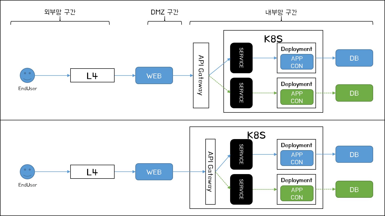 Blue-Green 배포는 동일한 환경을 갖춘 두 개(Blue 환경과 Green 환경)의 버전을 배포하고, 트래픽을 일괄 전환하는 방식이다. 새롭게 출시할 버전이 있는 경우 Green 환경에 배포하고 Blue 환경은 그대로 유지하며 트래픽을 처리한다. Green 환경으로의 전환은 대체로 서비스 절체가 가능한 수준인 도메인 단위가 될 수 있지만, 필요시 Context 단위가 될 수도 있다.
