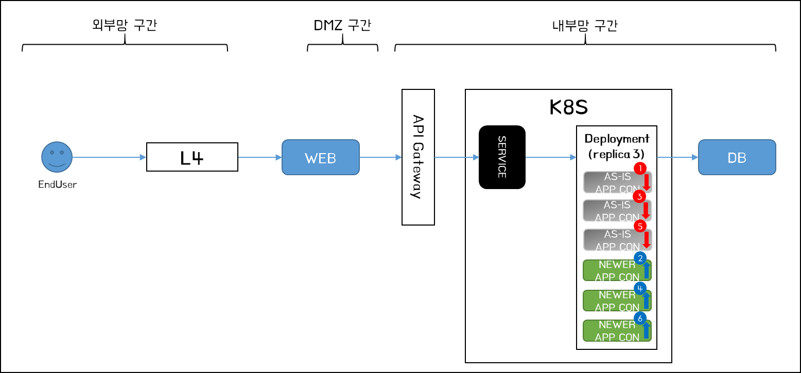 - Rolling Update 배포 방식은 다운타임 없이 신속하게 구축이 가능하지만, 롤백 시간이 오래 걸려 비즈니스 중요도가 높은 서비스에 적용은 어렵다.